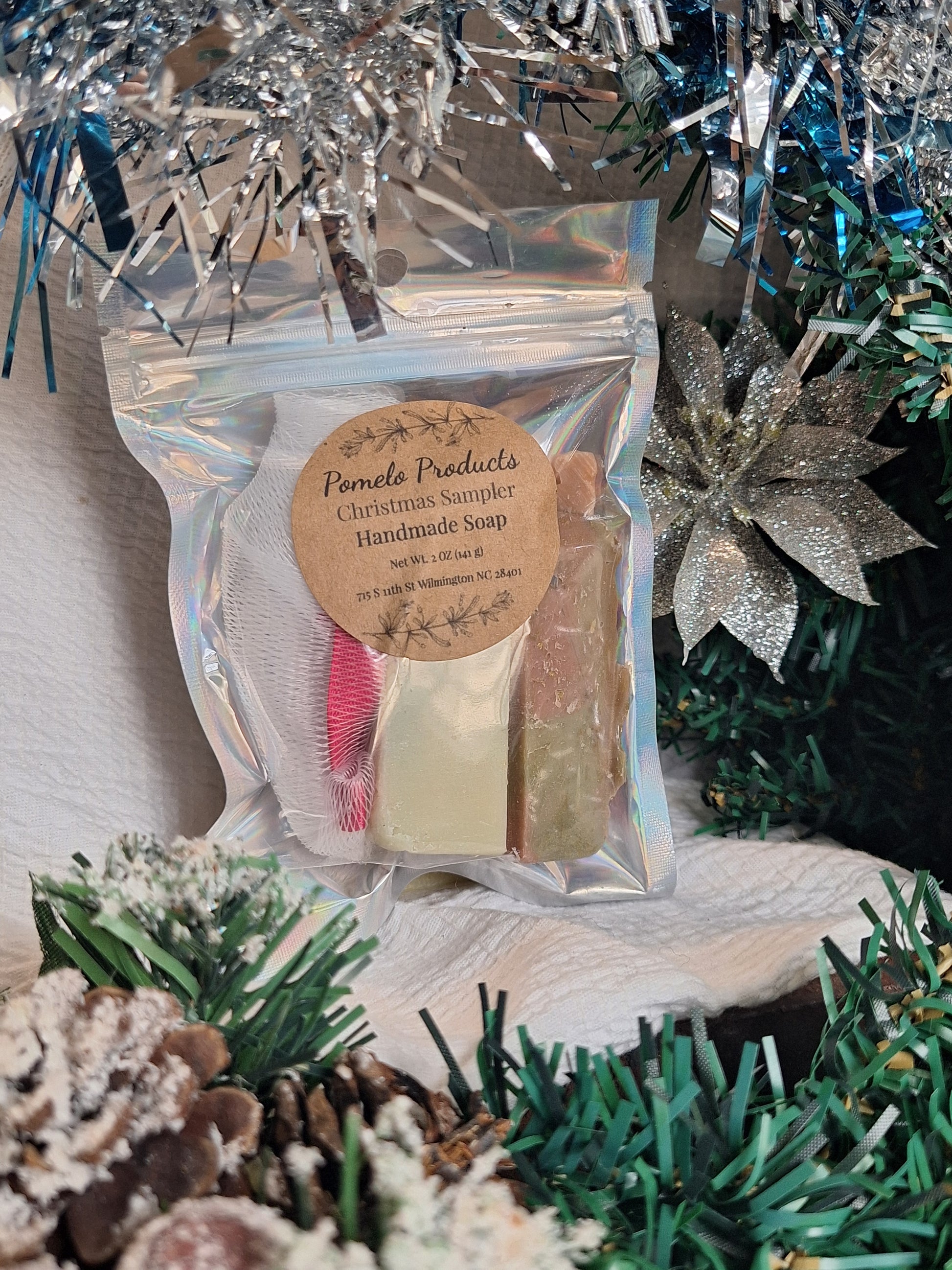 Merry Mashup is a curated collection of handmade soaps featuring one bar of each current holiday scent variety. Crafted with care, this set offers a luxurious exploration of festive aromas that gently cleanse and nourish the skin. Included is a complimentary soap saver, designed to prolong the life of your soaps and maintain their texture. This assortment is perfect for gifting or enjoyable personal use throughout the holiday season.
